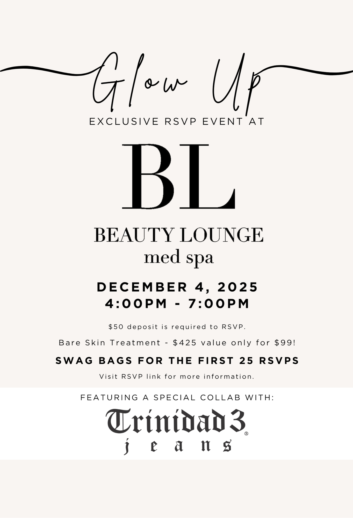 Join us for the Glow Up event at Beauty Lounge Med Spa, an exclusive evening dedicated to beauty, confidence, and style. This special event features a collaboration with Trinidad3 Jeans, blending luxury skincare with premium denim fashion for a one-of-a-kind experience. Guests will enjoy expert skincare consultations, exclusive treatment offers, and a stylish showcase celebrating individuality and self-expression.